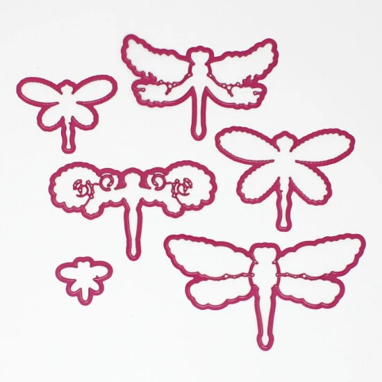 - Measurements: Large Dragonfly Die: 4โ x 2.25โ ; Decorative Swirl Dragonfly Die: 3.25โ x 2โ ; Medium Dragonfly Die: 3โ x 2โ ; Medium Scalloped Dragonfly Die: 2.75โ x 2โ ; Small Scalloped Dragonfly Die: 2โ x 1.5โ ; Mini Dragonfly Die: 1โ x 1โ