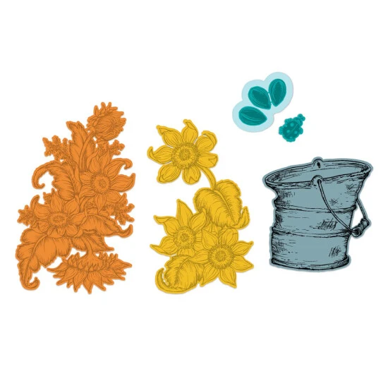 These dies are part of the Rustic Sunflower Collection and pair with the Rustic Sunflower Bucket Cling Stamp Set (sold separately).